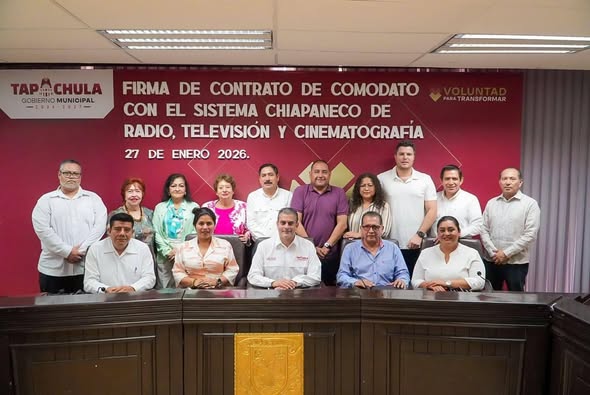 El presidente municipal de Tapachula, Yamil Melgar Bravo acompañado de la síndico, Cleo Ortiz Huerta, regidoras y regidores asistió a la firma del convenio de comodato con el Sistema Chiapaneco de Radio, Televisión y Cinematografía, encabezado por su director, Mario Escobar Gálvez.