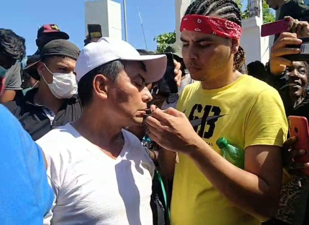 Un Grupo de migrantes se costuran la boca como protesta ante el instituto Nacional de migración en Tapachula.