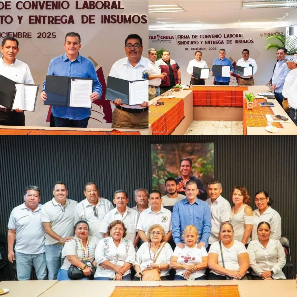 26, Dicme re del 2025.- Tapachula, Chiapas.— El presidente municipal, Yamil Melgar, encabezó la firma del convenio laboral con el Sindicato Único de Trabajadores al Servicio del Municipio, en un marco de diálogo, respeto y comunicación constante.